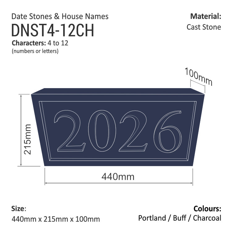 The price is for a 4-characters (numbers/letters) Date/Name Stone (such as ‘2022’), size 440 mm x 215 mm x 100 mm